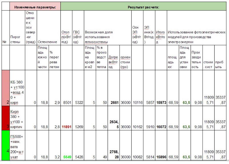 Згідно розрахунків раціонально мати в розпорядженні будинок входом строго на північ, в конструктивних рішеннях доцільно відмовитися від облицювання кирпичем і використати в якості зовнішніх стін газобетонний блок Aeroc завтовшки 500 мм з утепленням мінеральною ватою 200 мм, утеплення підлоги 1го поверху - 300 мм, перекриття 2го поверху - 450мм.