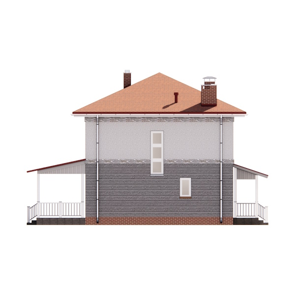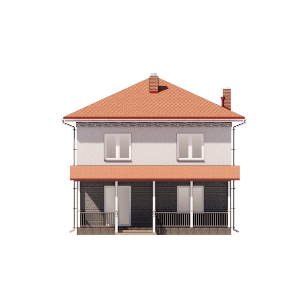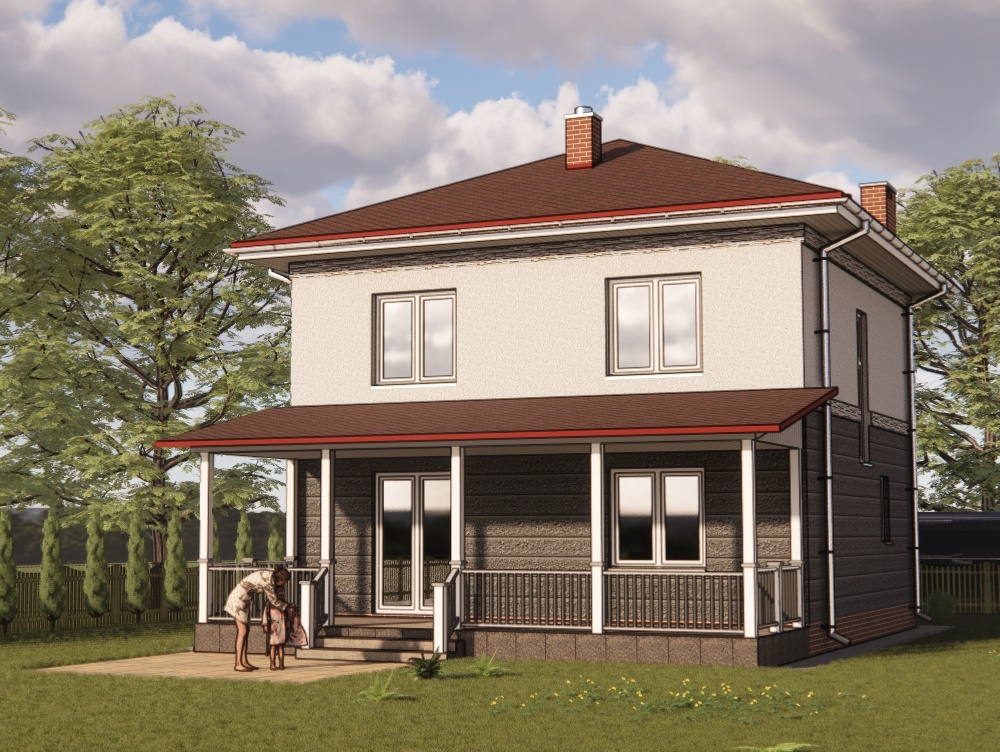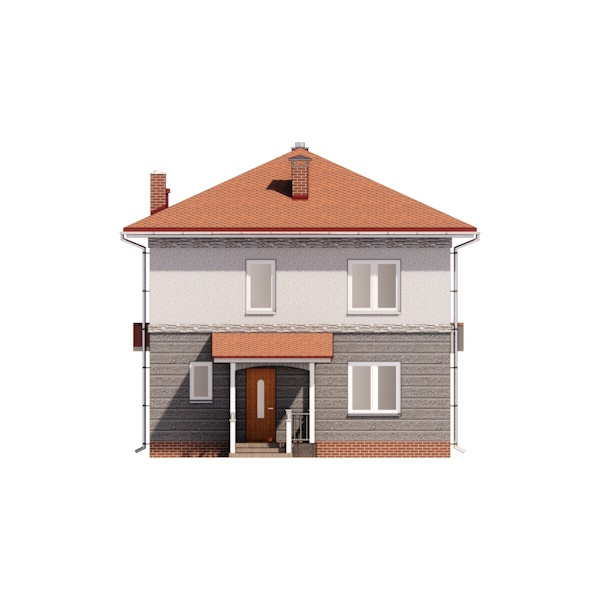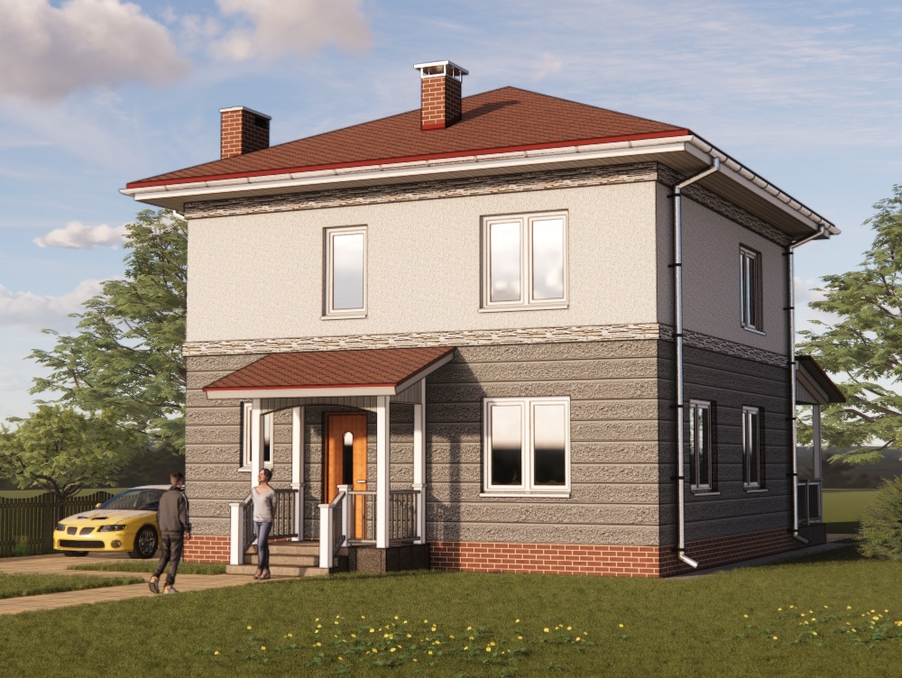 Зовнішнє оздоблення стін цього двоповерхового будинку - декоративна штукатурка. Стіни першого поверху пропонується покрити рельєфною штукатуркою холодних відтінків, стіни другого поверху покриті гладкою штукатуркою. Цоколь і труби на покрівлі пропонується облицювати декоративною плиткою «під цеглу» для зовнішніх робіт.