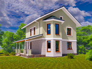 Цей проект є продовженням дуже популярної серії проектів “Ластівка”. Економічний та простий в будівництві будинок має розміри 9.6 х 9.06 м, з урахуваннням тераси та ганку пляма забудови складає 11.56 х 11.42 м. З метою додати до проекту родзинку будинок має еркер. На першому поверсі еркер є продовженям вітальні, на другому — спальні господарів.