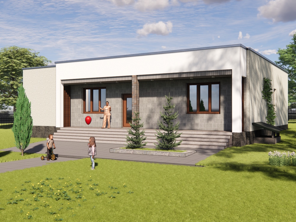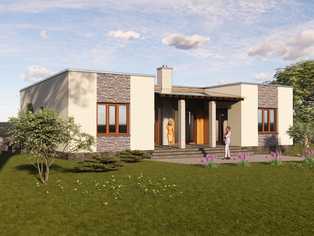 Проект сучасного будинку з підвалом укриттям. Три спальні, вітальня з каміном: