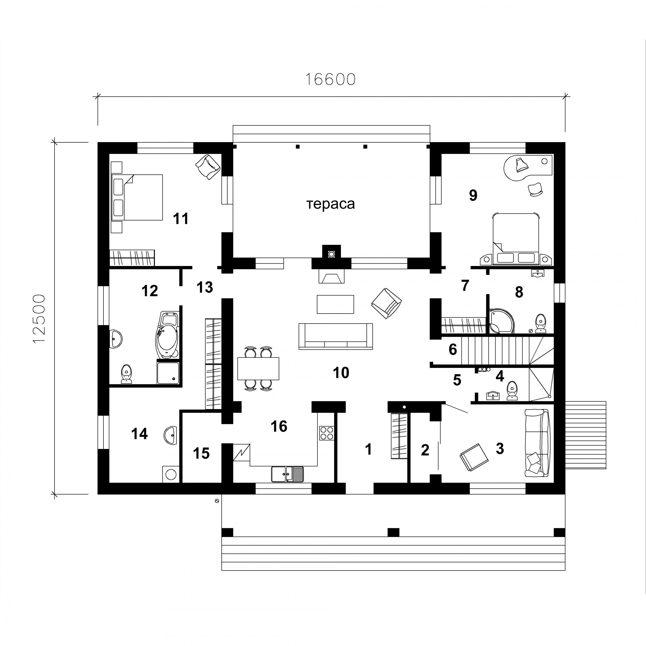 - Габарити будинку:16.6 м х 12.5 м