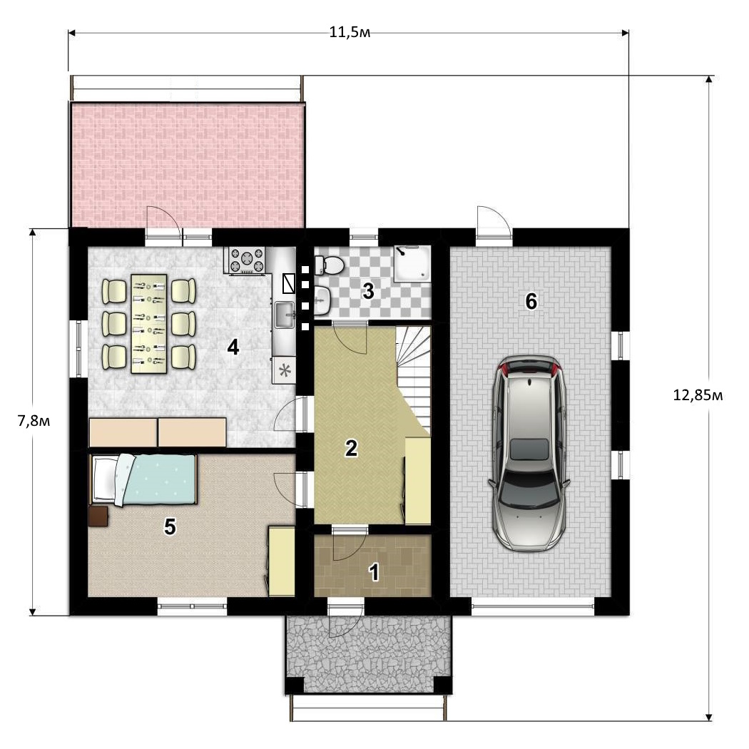 Проект будинку з трьома спальнями, кухнею-їдальнею, терасою та гаражем: