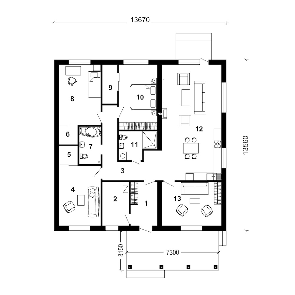 Проект будинку з чотирма спальнями, кухнею-їдальнею з каміном, та терасою: