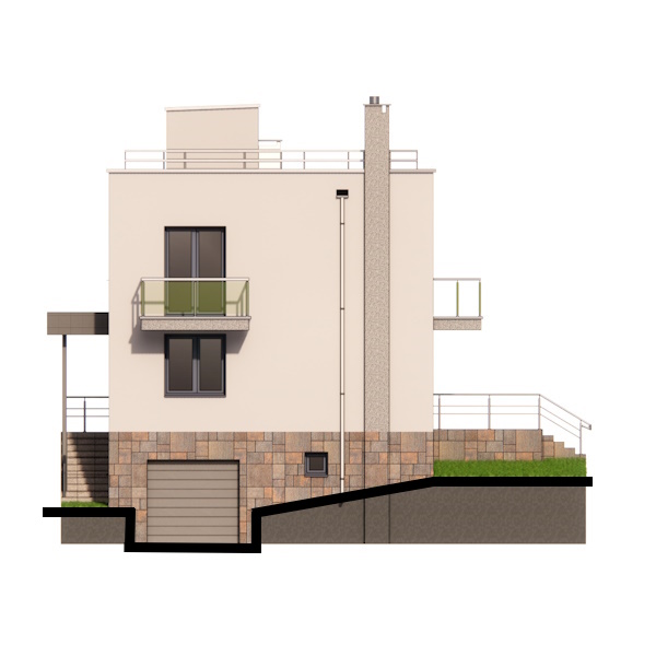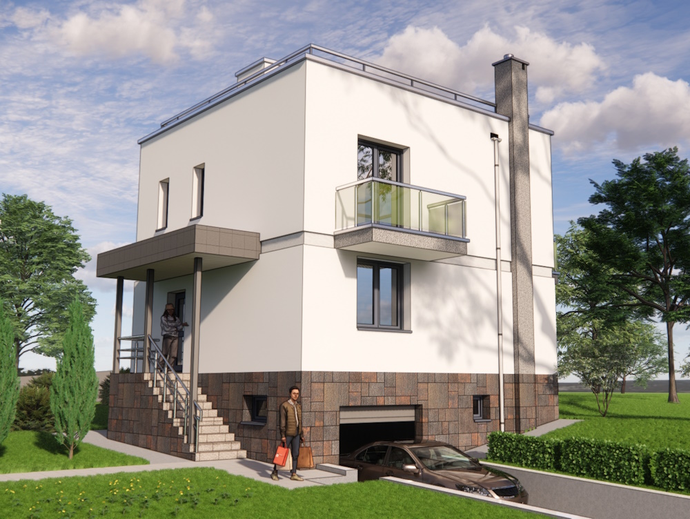 Проект двоповерхового будинку з плоским дахом, трьома балконами і гаражем