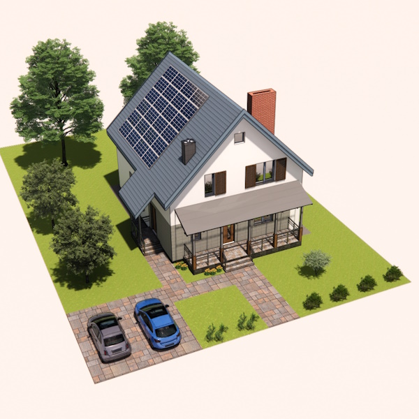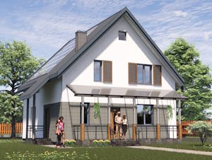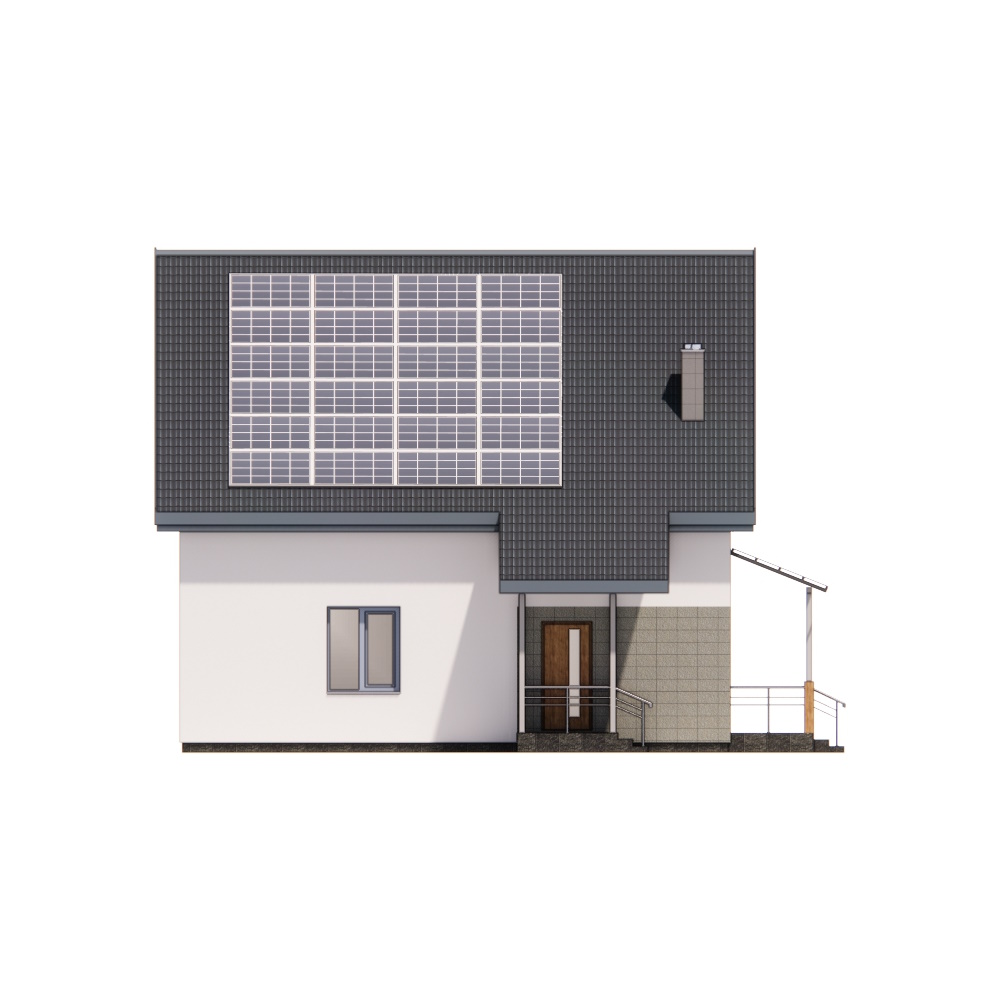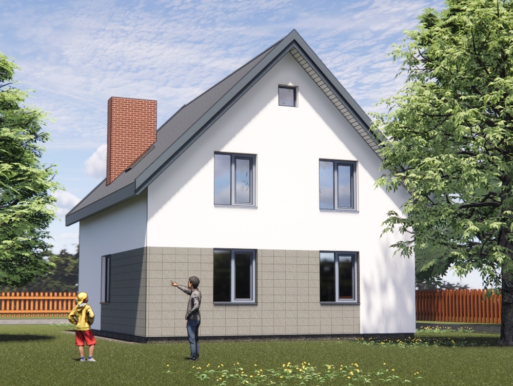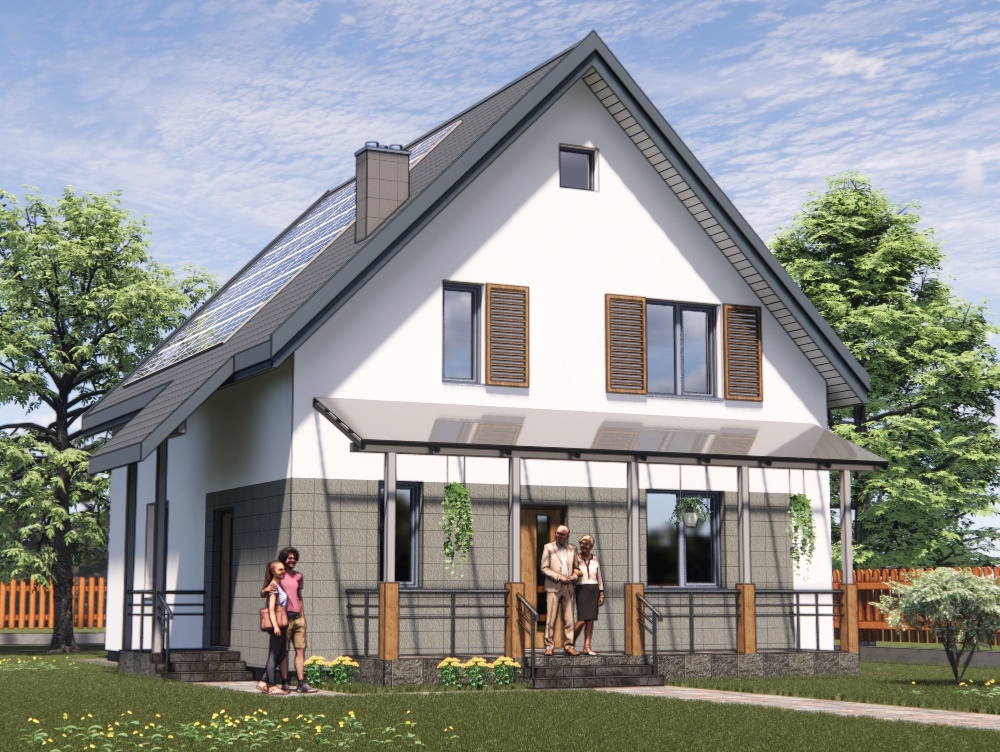 Проект мансардного будинку для двох сімей з розміщенням на кожному поверсі окремої квартири. Такий будинок є оптимальним вирішенням житлової проблеми для двох сімей, що складаються з близьких родичів. Наприклад сім'ї літніх батьків, на першому поверсі і молодої сім'ї на другому. Можливо використовувати одну з квартир для бізнесу. Наприклад для здачі в аренду. Кожна квартира має окремий вхід.