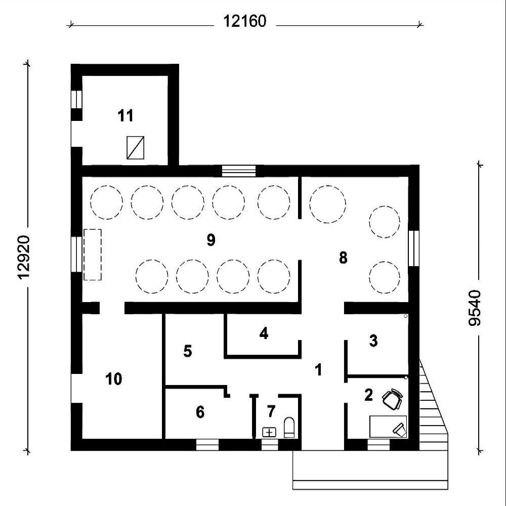 На першому поверсі розташована пивоварня яка складається з наступних приміщень: цех бродіння - 31,75м2, варочний цех - 17,7м2, комори для хміля, дріжджів, зерна, склад готової продукції, котлова, невеличка роздягальня, лабораторія та санвузол. В цеху бродіння запроектоване розташування дев'яти ЦКТ (ферментерів) та СІП мийки.