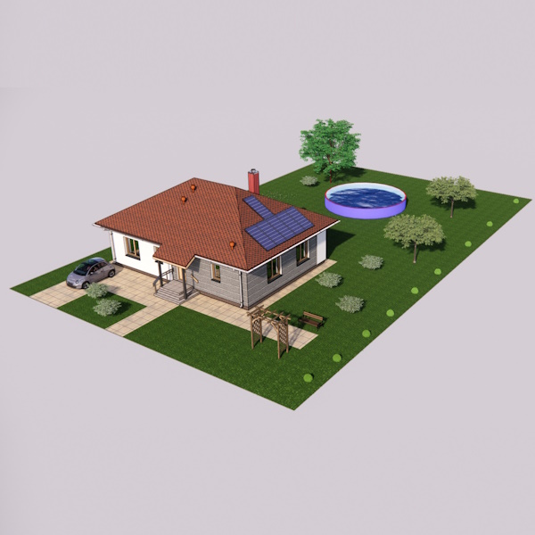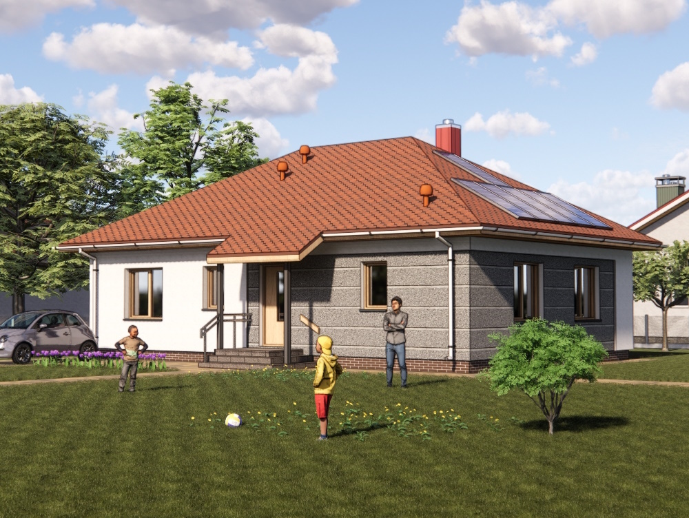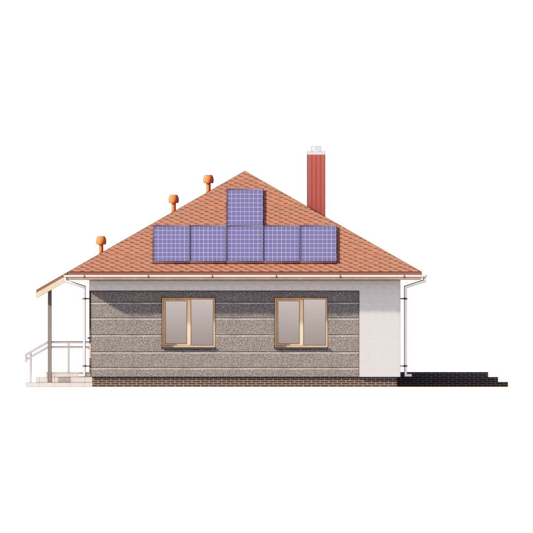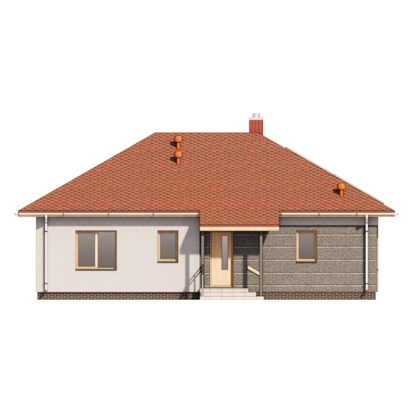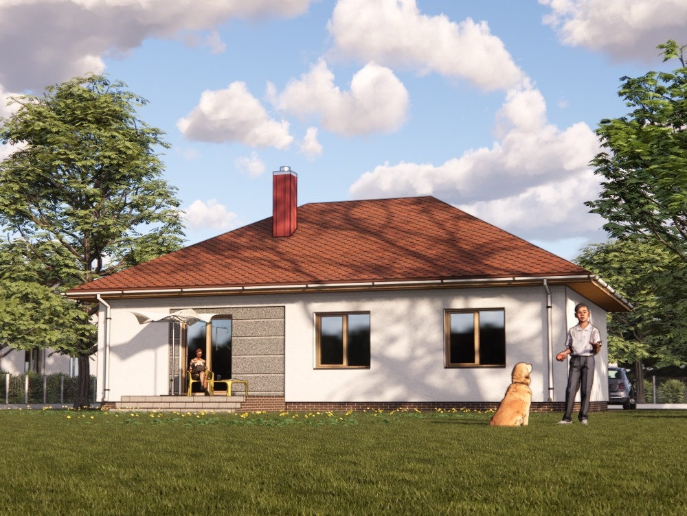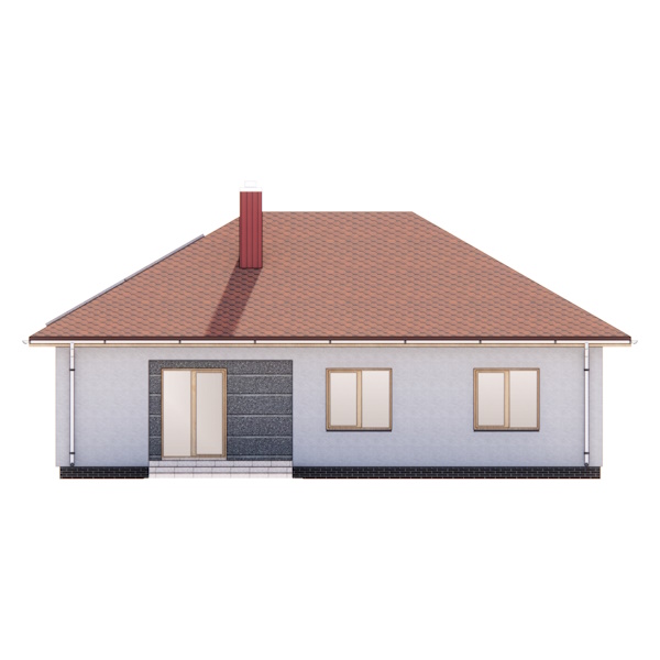 Проект одноповерхового будинку з трьома спальнями, каміном та терасою: