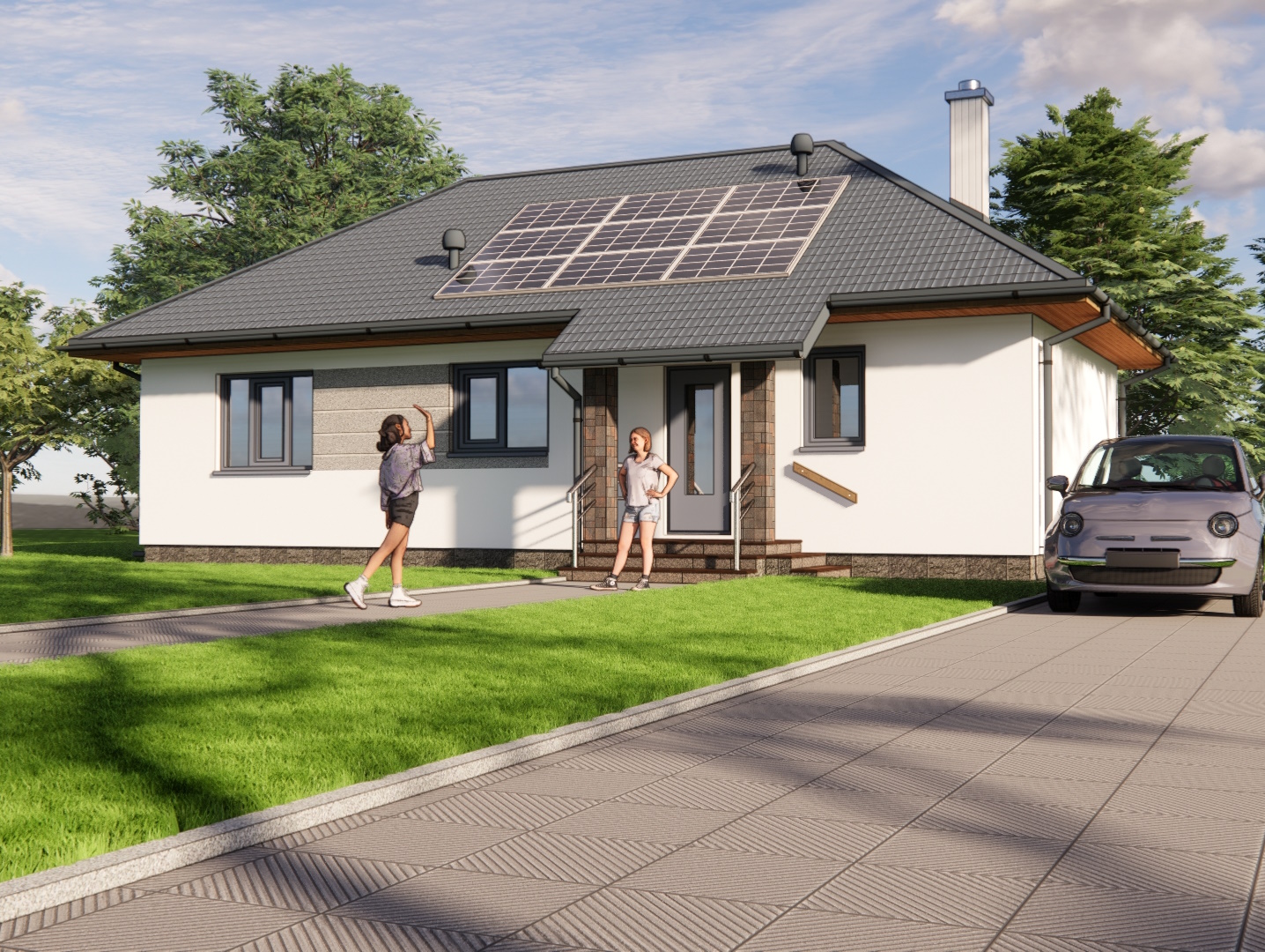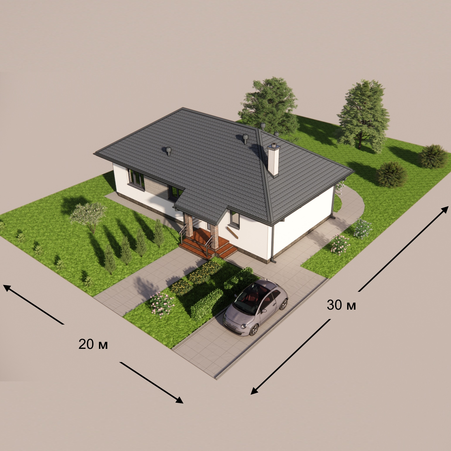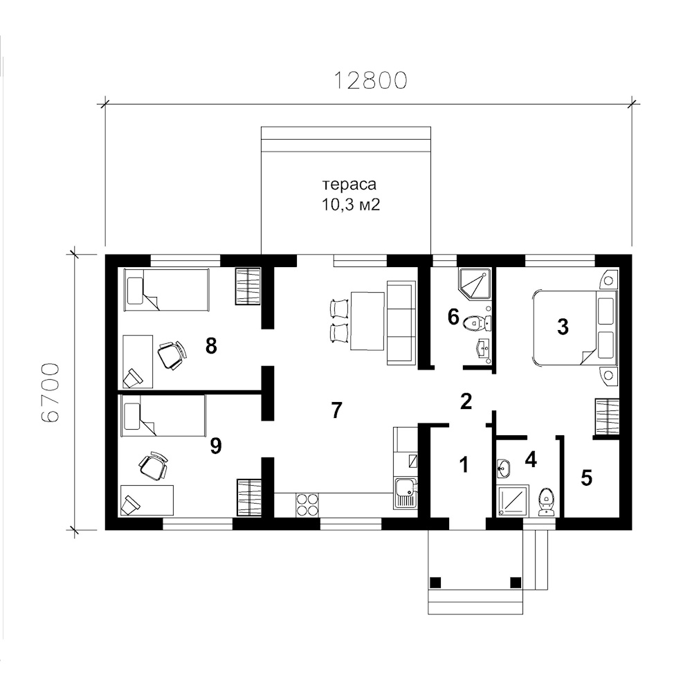 Проект “Плесецьке 2” - одноповерховий будинок з трьома спальнями та терасою.