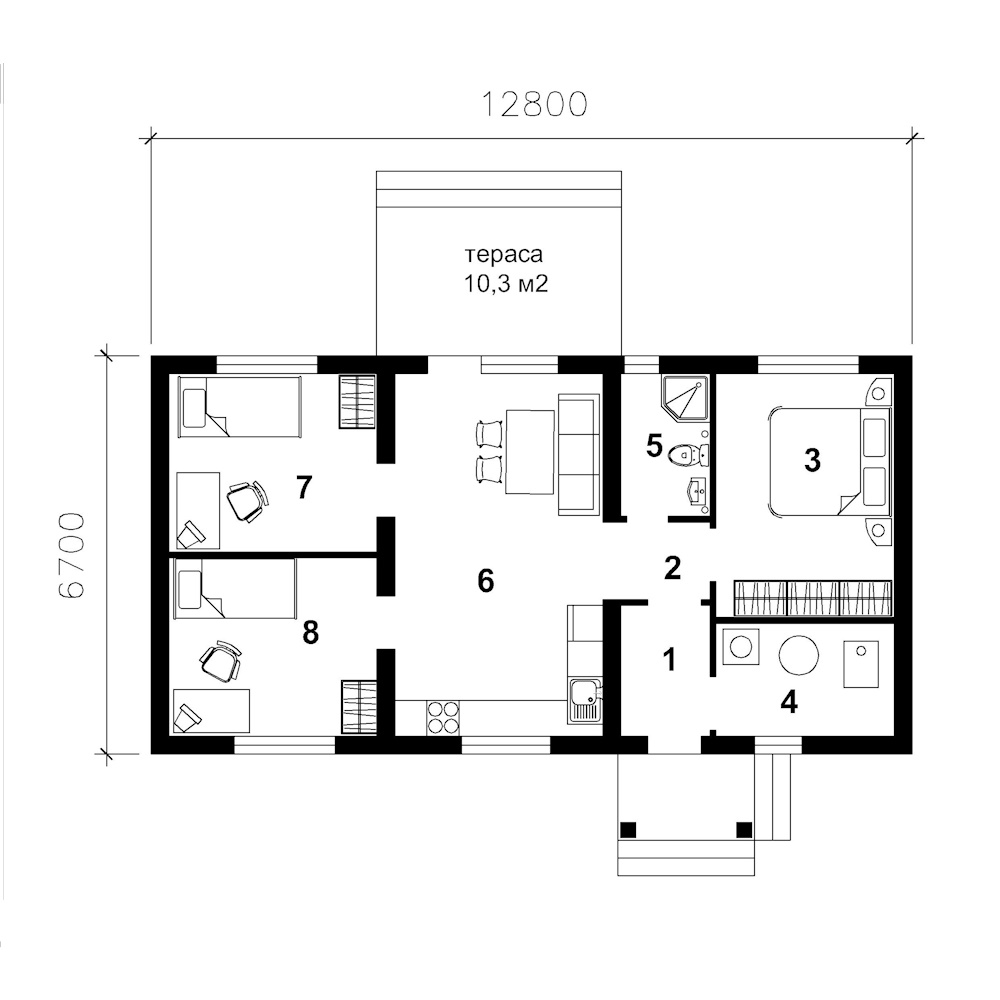- Габарити будинку:6.7 м х 12.8 м