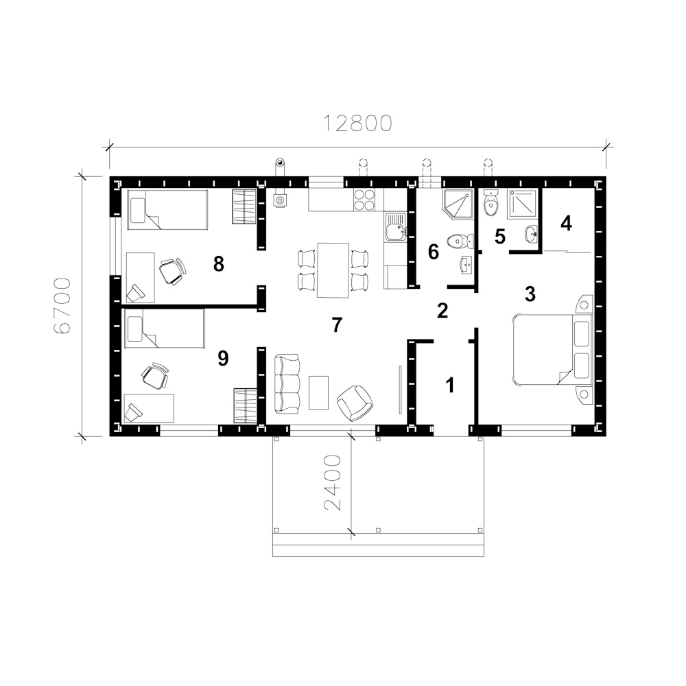 - Габарити будинку:6.7 м х 12.8 м