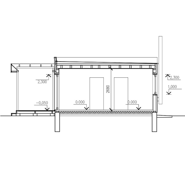 Перекриття плоске утеплене рулонною скляною або базальтовою ватою 300 мм. Будинок накритий плоским дахом з ухилом 2 град.