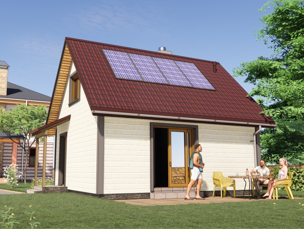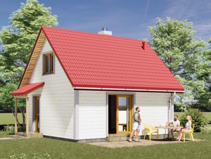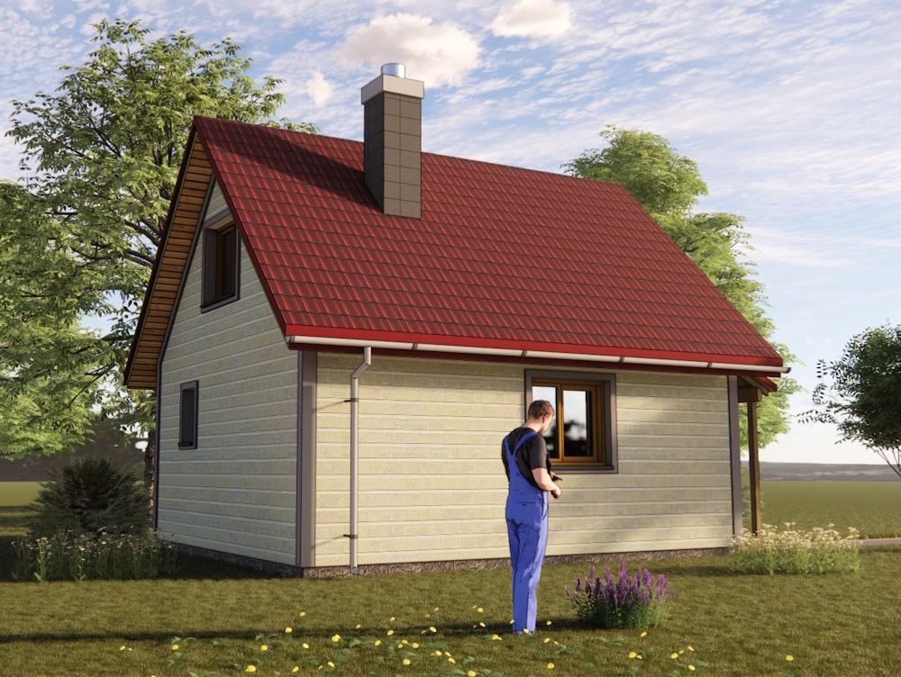 Мікро кухня, кімната, санвузол, сауна. Вхід в буднок через тамбур, що дозволяє зберегти тепло взимку. На горищі спальня. Фундаменти стрічкові з монолітного бетону, стіни-дерев'яний каркас з утепленням мінватою, перекриття-деревяне, покрівля з металочерепиці. Зовнішнє оздоблення - вініловий сайдінг.