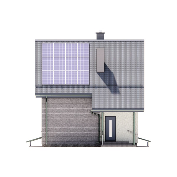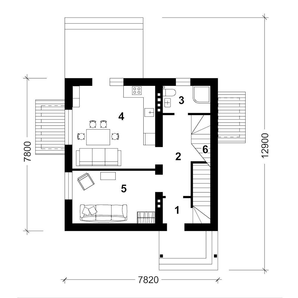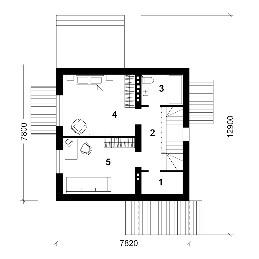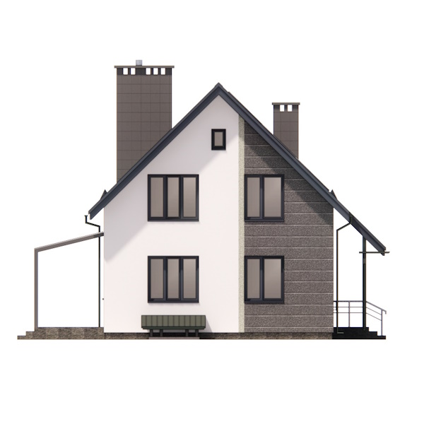 З тамбура запроектовані сходи у підвал. На першому поверсі знаходиться спальня, за нею — кухня-столовая. Через стіну, поруч з кухнею знаходиться санвузол. Санвузол другого поверху знаходиться над санвузлом першого. Таке рішення дозволило звести вентканали з кухні і санвузлів в одну трубу. На другому поверсі дві спальні, комора і санвузол. Будинок накритий двосхилим дахом.