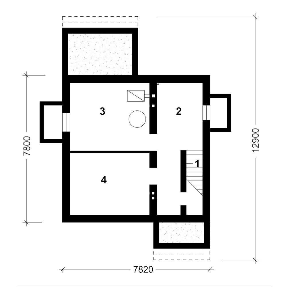 Під будинком розташований підвал в якому розташовано котельню. Як укриття передбачено використати приміщення 4 площею 13,9 м2. Для евакуації запроектовано три виходи, один через сходи в будинку та два приямки, що розташовані на протилежних фасадах. Стеля підвалу - залізобетонні плити. В разі необхідності може бути запроектовано монолітне перекриття.