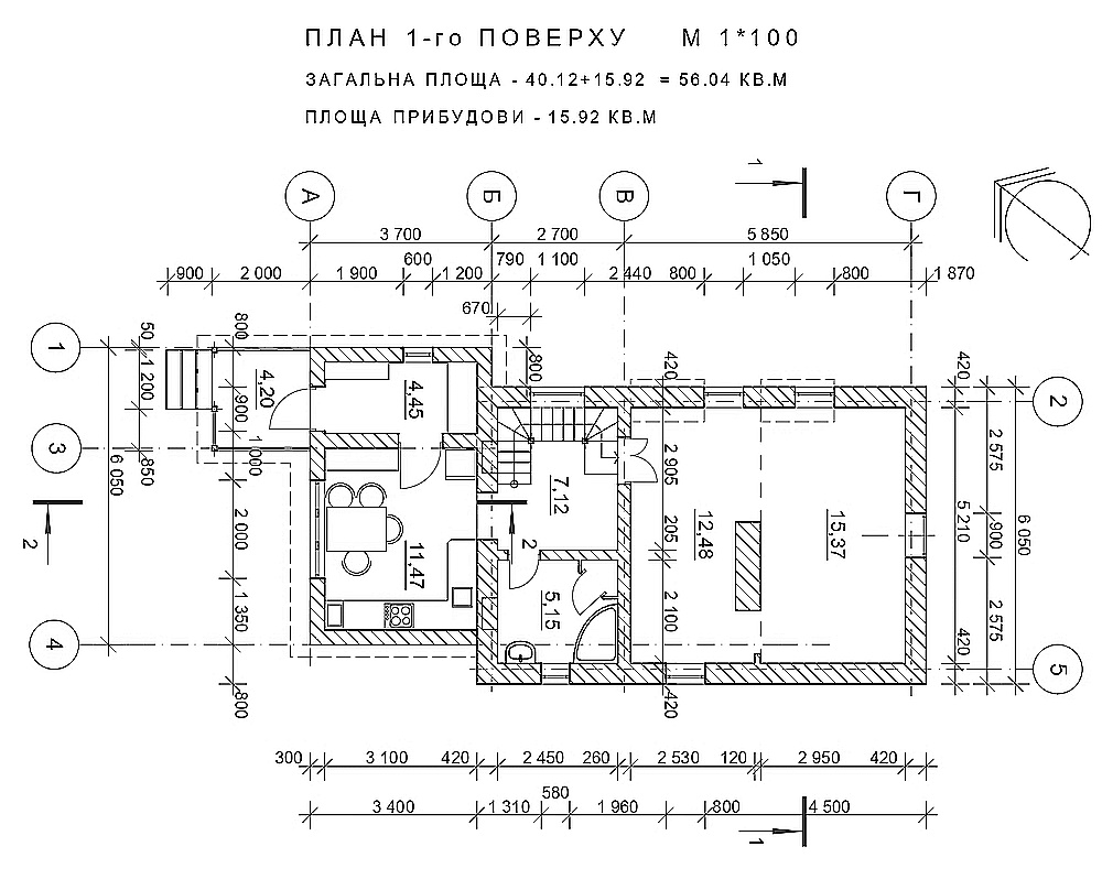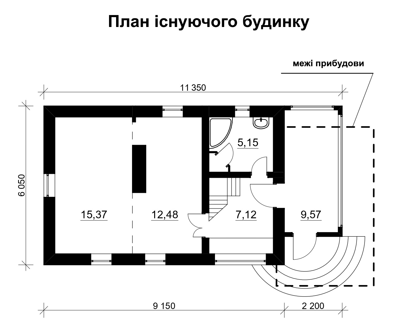 Проектом передбачений демонтаж старої веранди та частини перекриття першого поверху для влаштування сходів. Замість веранди запроектована прибудова 15,9 кв.м., де розташовані кухня-їдальня та передпокій. На місці старої кухні розташовані сходи. Загальна площа будинку збільшилась на 6 кв. та становила 81 кв.м.