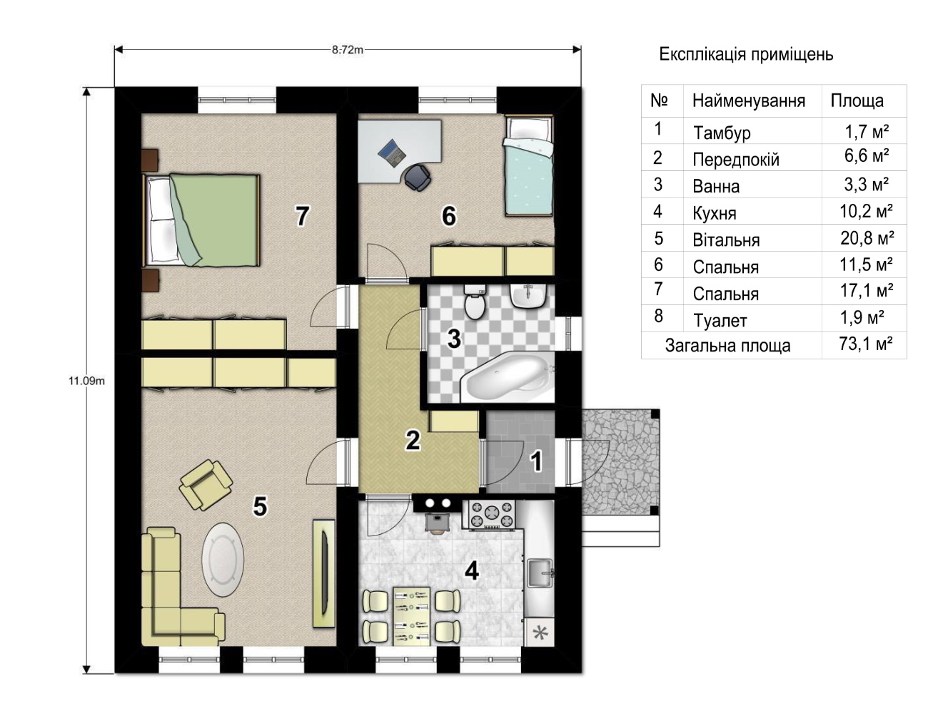 Розрахунок вартості будівництва «коробки» за проектом "Клен" — площа забудови 97 м2 (площа приміщень 72 м2). Будинок складається з трьох житлових кімнат, кухні, санвузла, передпокою.